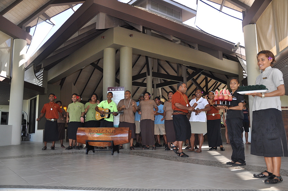 Následují den jsme provedli inspekci tohoto hotelu, a mikrobusem odjeli do Denarau Marina, kde jsme se nalodili na lod společnosti South Sea Cruises, která provozuje lodní dopravu mezi ostrůvky, na kterých jsou vystavěny hotelové resorty. Postupně jsme provedli inspekci hotelů Malolo Island Resort a Likuliku Lagoon Resort, oba dva resort jsou na ostrově Malolo, největším ze souostroví Mamanuca. Zaujal nás především resort Likuliku, který disponuje i vodními bungalovy, samozřejmě nechybí ani spa a svatební kaple. Po prohlídce obou hotelových resortů jsme pokračovali dalším spojem společnosti South Sea Cruises na ostrov Mana, na kterém je Mana Island Resort. Na molu nás přivítala Cecilia, obchodní manažerka a náš kontakt. Po obligátním uvítacím drinku jsme se ubytovali s tím, že na inspekci hotelu dojde až pozítří. Ubytovali nás v mezonetových pokojích přímo u pláže, takže jsme přes terasu zamířili na na pláž a vykoupat se. Následující den jsme po snídani zamířili opět spojem South Sea Cruises na inspekci Castaway Island Resort, kde jsme si prohlédl hotel, vykoupali se a po obědě jsme nastoupili do připraveného rychlého člunu, který nás dopravil na inspekci Matamonoa Island Resort, kde nás zaujalo především Spa a také skutečnost, že stálí hosté a novomanželé mají pokoje označeny křestními jmény, které personál vyřeže ze dřeva. Dále jsme pokračovali člunem na inspekci Tokoriki Island Resort. Jako vždy nás přivítali uvítacím drinkem a navíc hudebním vystoupením většiny přítomného personálu. Z tohot resortu nás zaujaly především bungalovy s vlastním bazénem. Po skončení inspekce jsme se vrátili na „náš“ Mana Island, kde nás čekala společná večeře s Cecilii. Další den jsme po snídani provedli inspekci resortu, do vzdálenějších líbánkových bungalovů jsme dojeli golfovými vozítky.Vozíky mimochodem náleží ke každému z těchto bungalovů. Ve spa jsme si mohli zakoupit kosmetiku Fiji pure a pak jsme se již vypravili na molo, kde jsme vyčkali na připlutí lodě a s tou pak vypluli zpět na hlavní ostrov Viti Levu. Po přistání v marině Denarau jsme se přistaveným mikrobusem přepravili na inspekci hotelu Fiji Beach Resort Managed by Hilton kde nás ji očekávali se slovy : „ Již o Vás víme, psali o Vás v novinách.“ Po inspekci hotelu a obědě s manažerkou jsme se stále v oblasti Denarau přemístili mikrobusem do posledního plánovaného hotelu, a to do Radisson Fiji Resort Denarau Island. Zde nás přivítalo, kromě uvítacího drinku, rozsáhlejší pěvecké těloso složené ze zaměstnanců. Inspekce tohoto hotelu byla velmi krátká, manažerka nám ukázala pouze jeden pokoj, výhled na bazén a řekla nám, že bude lepší když si služby vyzkoušíme na vlastní kůži, že nás nebude již déle zdržovat. Což jsme přivítali, rychle se ubytovali a zamířili na pláž či k bazénu. Večer jsme měli společnou večeři se zástupci Pacific Destinationz.