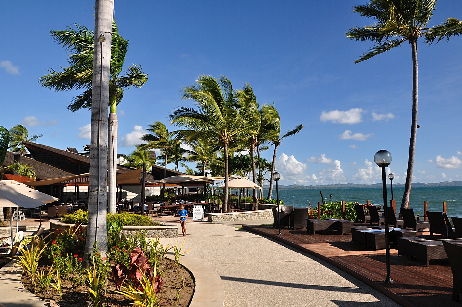 Na letišti nás již očekávají zástupci společnosti Pacific Destinationz, kteří se o nás budou po dobu pobytu starat a ukáží nám jimi nabízené hotely a další služby. Proběhne v Pacifiku obvyklé přivítání s věnci květů, obdržíme drobné dárky a nastoupíme do připraveného mikrobusu. Naučíme se základní pozdrav Bulá, který nás bude provázet celý pobyt.Čeká nás cesta na opačnou stranu ostrova, do hotelu Outrigger on the Lagoon Fiji Resort. Cestou se ještě zastavíme ve městě Nadi, na krátký nákup. Cesta mikrobusem trvá asi hodinu, a musíme konstatovat, že silnice jsou zde ještě rozbitejší než u nás. V hotelu nás již očekávají s uvítacím drinkem a osvěžujícími ručníky. Naštěstí chápou, že jsme po dlouhé cestě jistě unaveni, takže nám rychle rozdají klíče od pokojů a máme volno až do společné večeře. Dám si věci na pokoj, a protože kvůli vyrovnání se s časovým posunem nechci jít spát, beru si plážový ručník a vyražím se vykoupat v Pacifiku. Projdu krásnou tropickou zahradou, okolo bazénů a jsem na pláži. Tam mne však čeká nepříjemné překvapení, je odliv a vody po kotníky. Chvíli se brodím, ale pak mne to přestane bavit a jdu radši k bazénu. Z vody pak pozoruji další účastníky naší infocesty, kteří na pláži zažívají stejné zklamání jako já a postupně se tak scházíme v bazénu. Někteří si dáme v baru lehčí pozdní oběd a pústupně se vracíme na pokoje vybalit a připravit se na večeři s managmentem hotelu. Večeře pak proběhne ve velmi milé atmosféře, Fidžijci jsou velmi přátelští a pohostinní lidé. Po večeři nás berou ještě na diskotéku, ale jsme po dlouhé cestě dost unaveni a tak se zdržíme jen krátce a pak se omlouváme a jdeme spát.