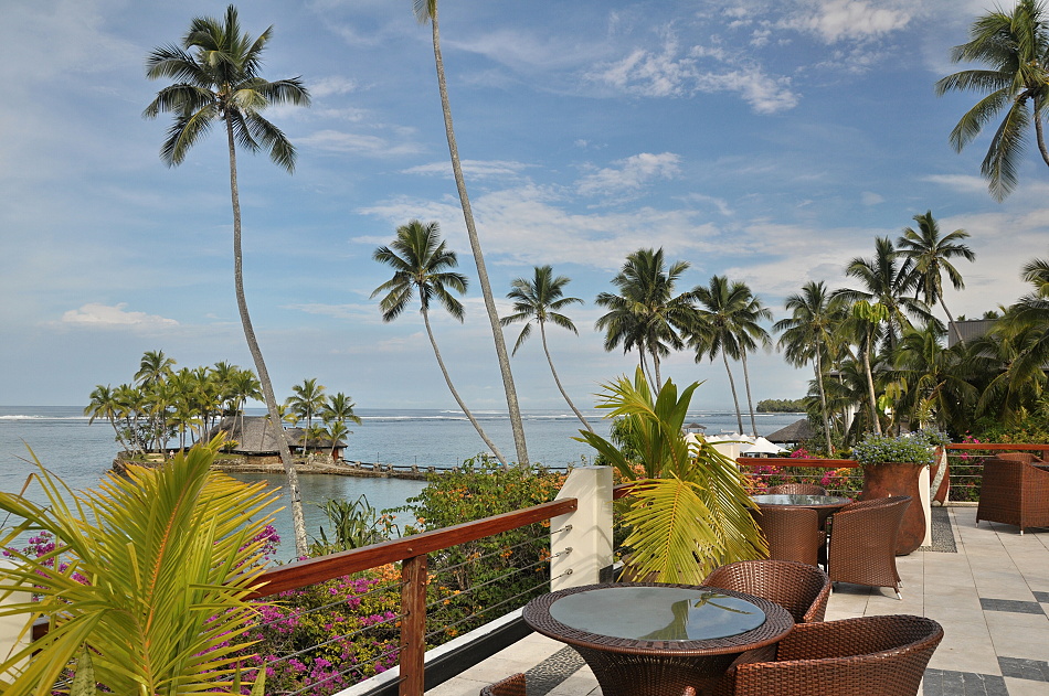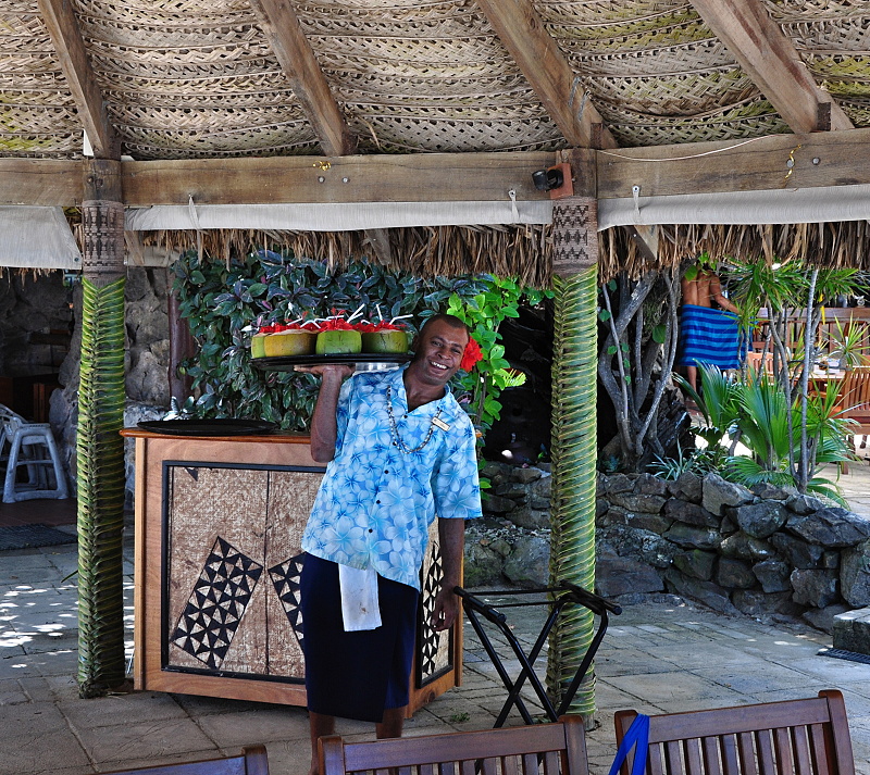 Naší nejbližší zastávkou je hotel Shangri La Fijian Resort & Spa, tento hotel leží na ostrůvku těsně u pobřeží, jeho pláže jsou jak na oceán tak i do laguny, takže se s odlivem vyrovnává lépe. Nás čeká, po uvítacím drinku, obligátní prohlídka pokojů, restaurací, spa a svatební kaple. Tady mají spa i kapli přímo u pláže a nabízejí i svatby pod širým nebem. Opět nasedáme do mikrobusu a jedeme na další inspekci, tentokrát hotelu Intercontinental Fiji Golf Resort & Spa. Tento pouhé 2 roky starý designový hotel nás vítá, kromě obligátního drinku i domorodými bubeníky. Po přivítání následuje prohlídka tohoto moderního hotelu, který se pyšní mimo prostorných a luxusně vybavených pokojů, i pláží Natadola, která byla časopisem National Geographic zařazena mezi 100 nejkrásnější pláží světa. Prohlédneme si i rozsáhlé spa a zamíříme na oběd do restaurace u jednoho z bazénů. Po obědě nás čeká ještě návštěva blízkého 18-ti jamkového golfového hřiště a pak již pokračujeme k dalšímu hotelu. Naším cílem je Warwick Fiji Resort & Spa, kde následující 2 noci přenocujeme. Po příjezdu a obvyklém uvítacím drinku nám manager hotelu ukáže několik pokojů různých kategorií, restaurace a vyhlídkovou terasu. U tohoto hotelu proběhla před lety úprava mořského dna, a proto je zde dostatečná hloubka na plavání i během odlivu. Po skončení prohlídky hotelu nám ukázal rybí restauraci na malém ostrůvku spojeném s pevninou molem, kde nás bude čekat večeře s managmentem. Dali jsme si zavazadla na pokoje, a šli se vykoupat. Teplota moře se na Fidži pohybuje okolo 29° C, takže není problém se koupat i navečer. Pak jsme se již šli obléknout na večeři. Při příchodu do restaurace jsme se absolvovali „Kava ceremony“, tento v Oceánii běžný obřad je na Fidži pravidelnou součástí společenských setkání. Večeře opět proběhla ve velmi přátelském duchu, podávána byla pestrá nabídka ryb a jiných mořských plodů.