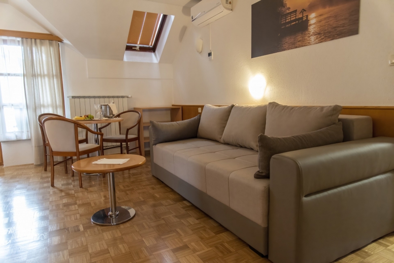 rodinné pokoje až pro 6 osob, větší obývací pokoj s rozkládací pohovkou navíc a samostatná ložnice, vlastním sociální zařízení (sprcha, WC), telefon, Kabel-TV, minibar, fén, župan, balkon nebo terasa