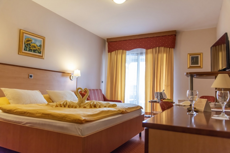v hotelové 3* "textilní" budově, v 1.patře, pro 2-3 osoby, dvoulůžkové pokoje, velká postel pro 2 osoby, rozkládací křeslo jako přistýlka, klimatizace, trezor, telefon, kabel-TV, internetová přípojka, minibar, sprcha/WC, fén, župan, balkon